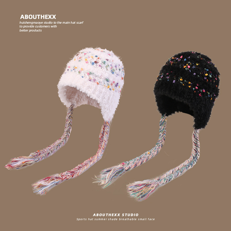 韓国版insカラー豆帽子女性ぬいぐるみニット帽秋冬保温耳保護顔小流蘇毛糸