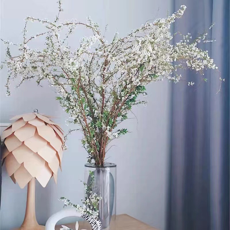 雪柳の新枝、水耕栽培の乾燥枝、怠惰な緑の植物、水にさらすと咲く室内花、八重咲きの鉢植えフラワーアレンジメント