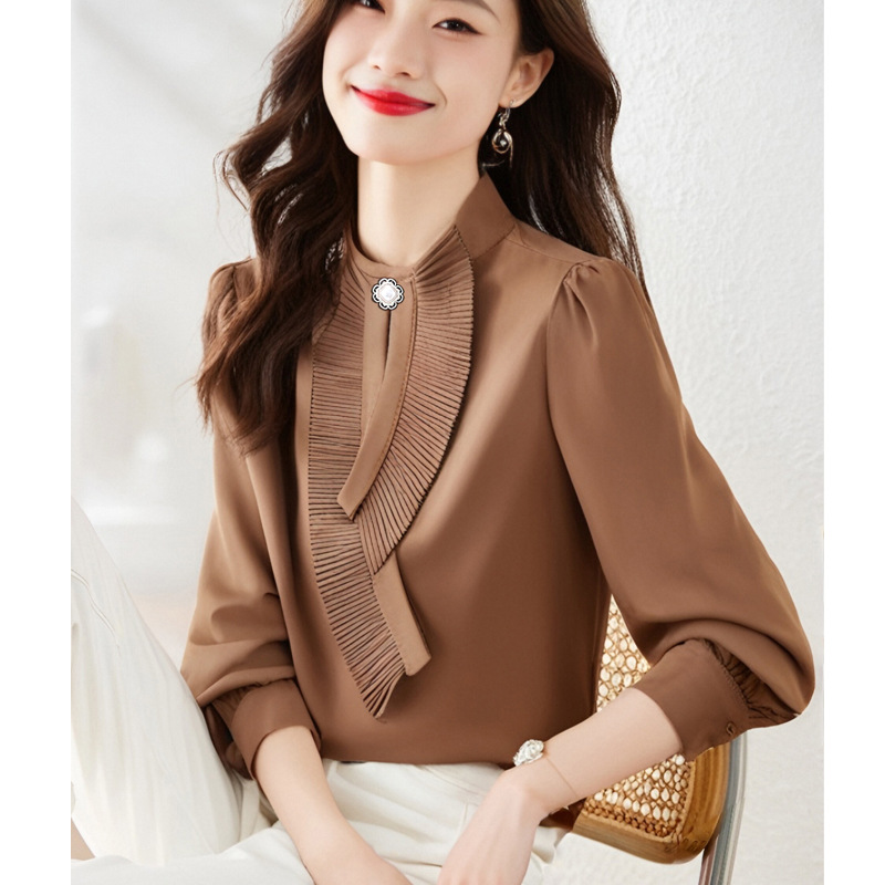 2024秋冬の頭の韓国版の百合半高襟の長袖のサテンの上着の女性のメーカーは直接販売します。