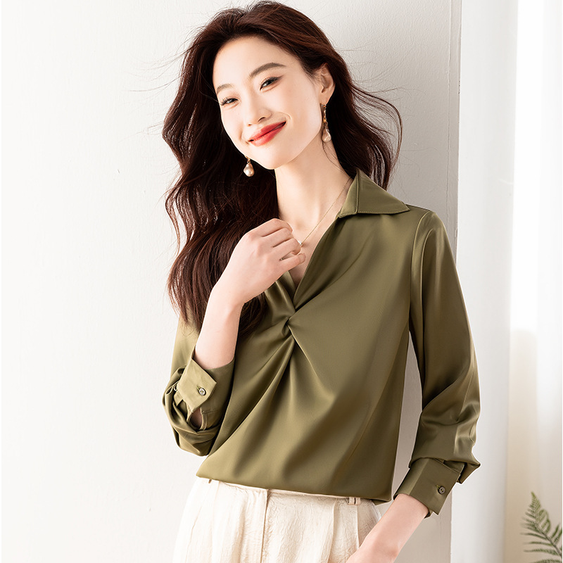 実拍2024秋胸がシャツを捻っている女性の垂れ下がったサテンの上着には、軽熟なレトロな香港風の大量スポットがあります。