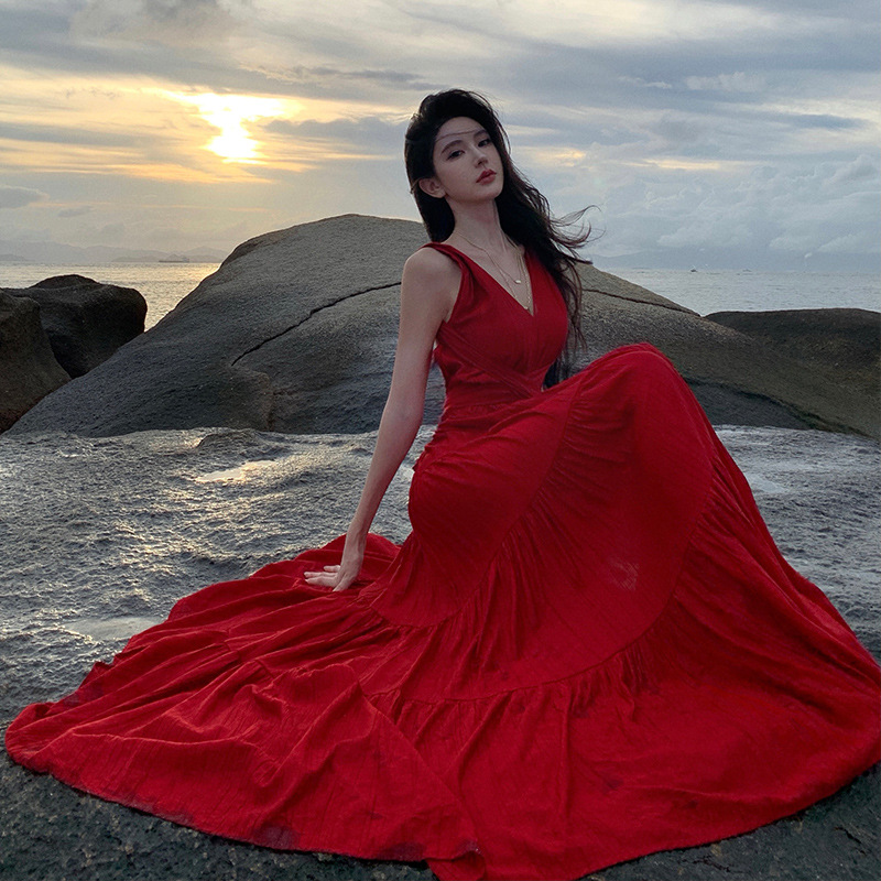 新作のフランス式ロングスカート気質減齢リゾート風砕花ストラップワンピース女性