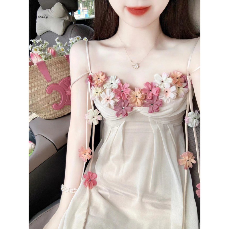 冷たくてゆるいストラップワンピース女性夏の小柄な休暇の花の長いスカートの気質はやせている砂浜を現します。