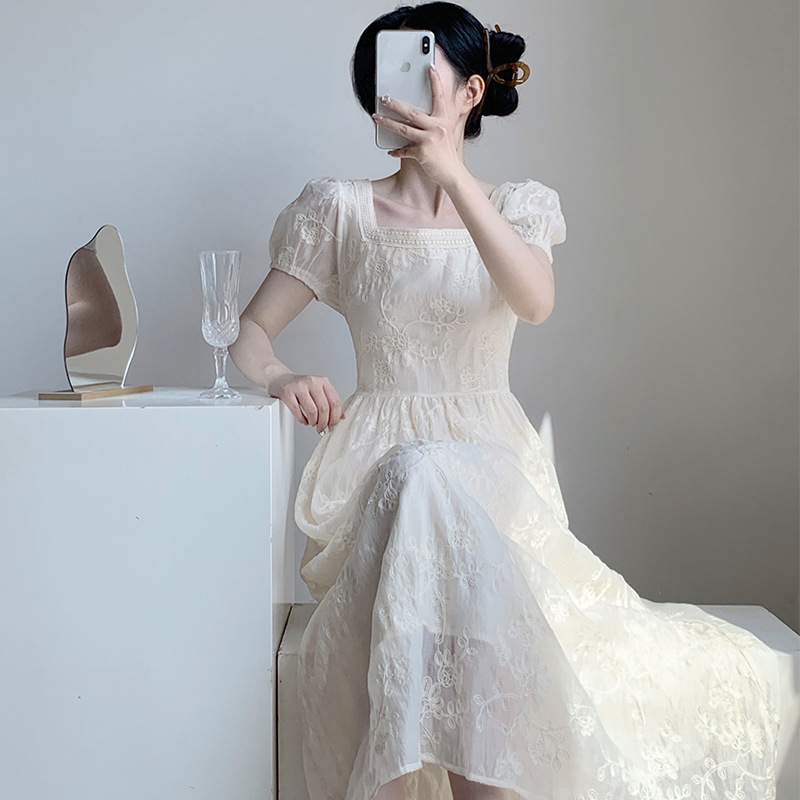フランスの初恋のロングスカートの夏のスカートの新型の気質の高級な方の襟は白い腰の顕ジャカードのワンピースを収めます。