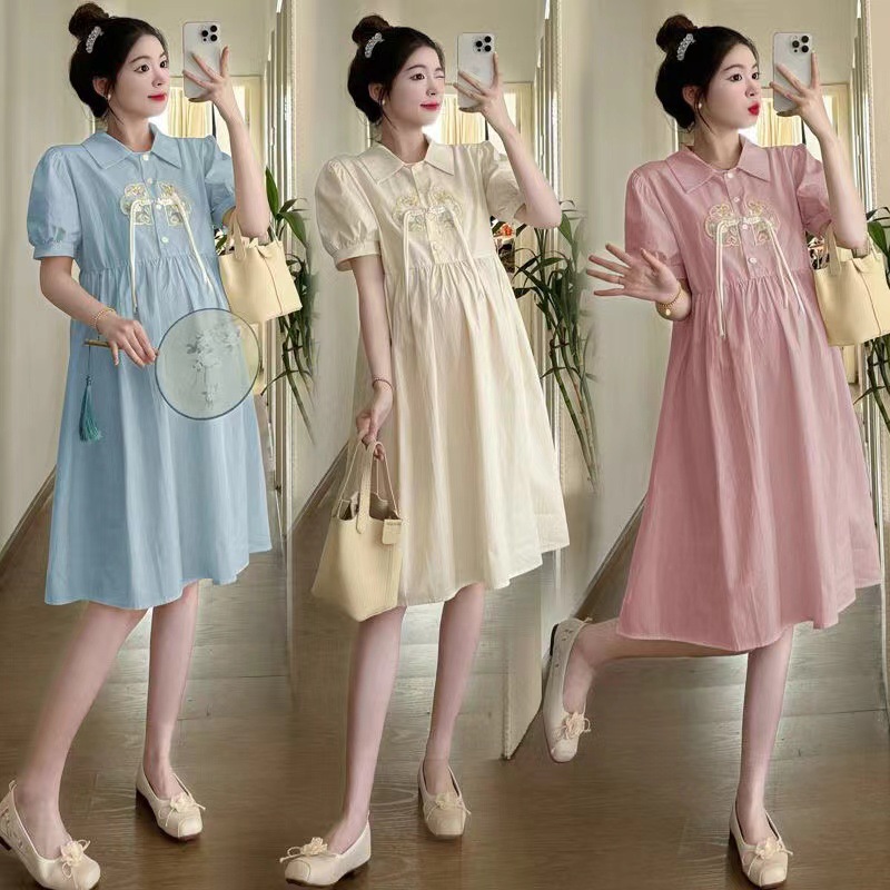 妊婦の新しい中国式のワンピースの夏の国風の盤口の妊婦の服の復古の刺繍のシャツの襟の百合のゆったりしているスカート