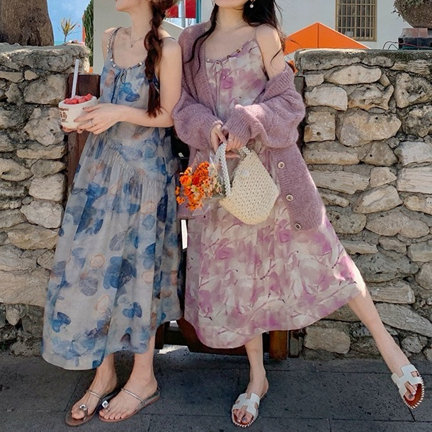 Underpassオリジナルフレンチバカンスローズ花気品ロングプルオーバーノースリーブ雰囲気感ストラップワンピースレディース