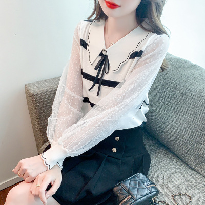 年齢を減らして色を合わせます。子供の襟のシフォンのシャツの女性2023夏の新型の韓国版の泡の袖の木の耳元はやせているシャツを現します。