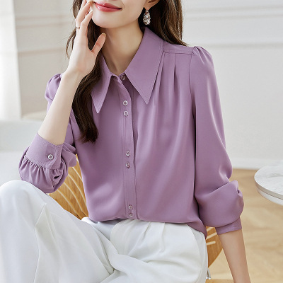 シャツの女性の紫色の長袖の2023秋の服の新型のファッションのフランスの上着のシフォンのシックな洋風の泡の袖のシャツ