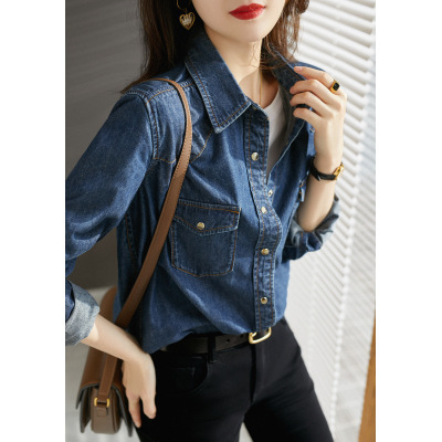 レトロな個性のデニムのシャツの女性2023年の新型の長袖の大衆はゆったりしています。