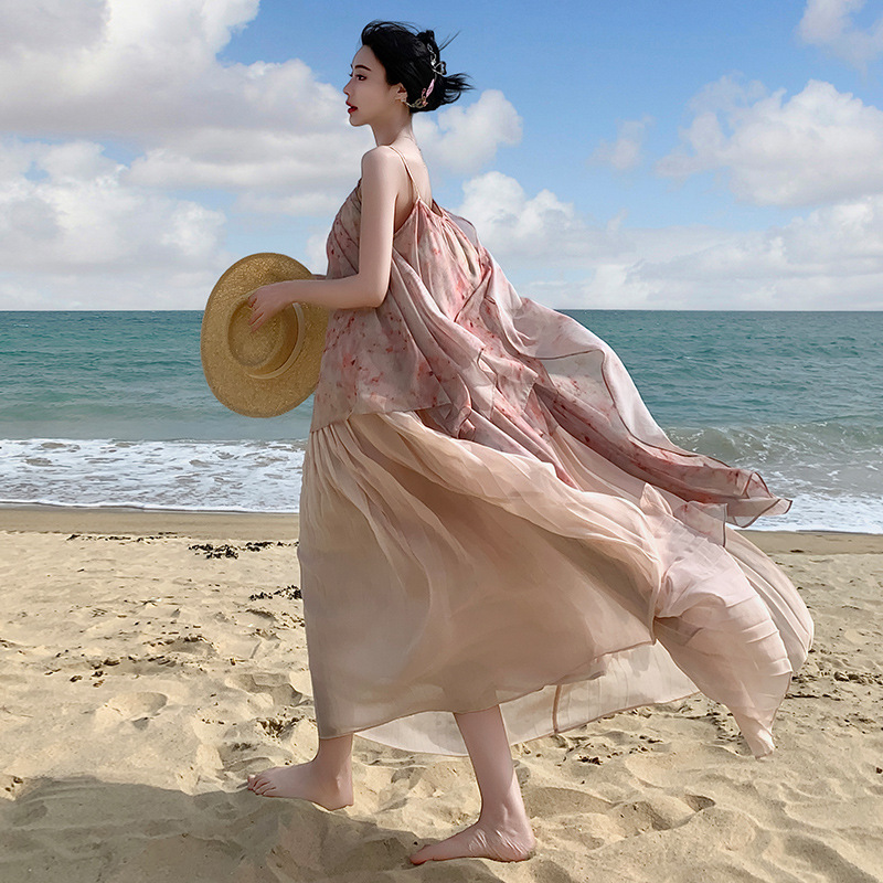 小柄な人向けの春夏のスーパーフェアリーファッション新しい海辺のリゾートスタイルのブルーミング花柄サスペンダードレス
