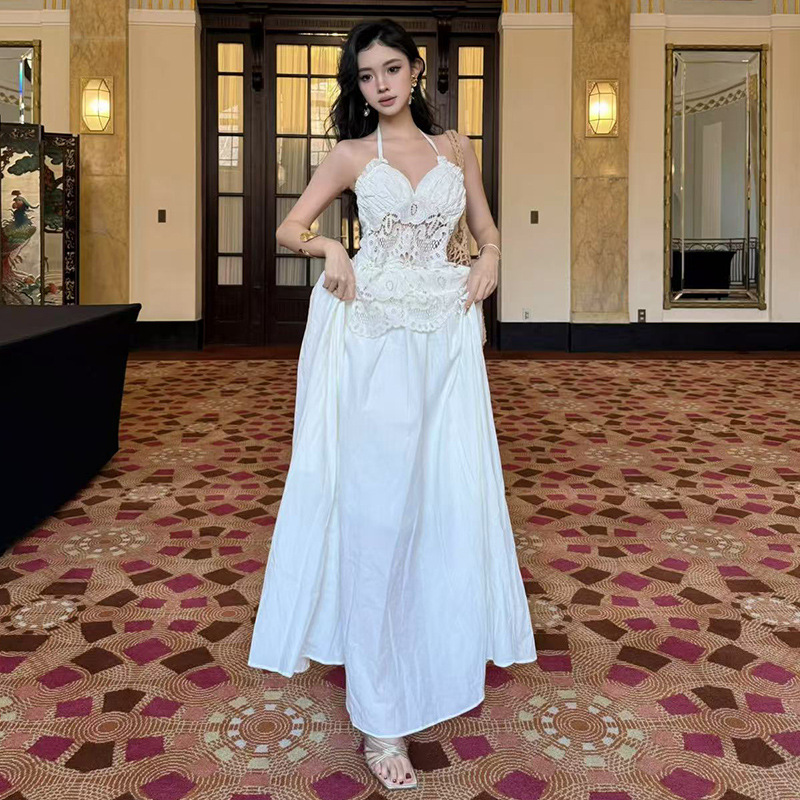 ホワイトレースカットアウトホルターネックドレス女性夏Vネックノースリーブロングドレス