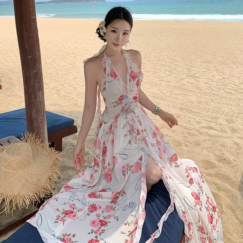フレンチプリーツ花柄刺繍サスペンダースカートVネック気質海辺休暇ドレス