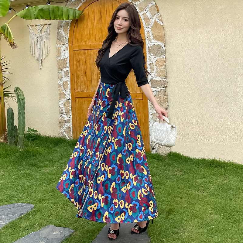 ローズプリント V ネックドレス女性のための春スリム休暇ロングスカート写真プリント超妖精スカート
