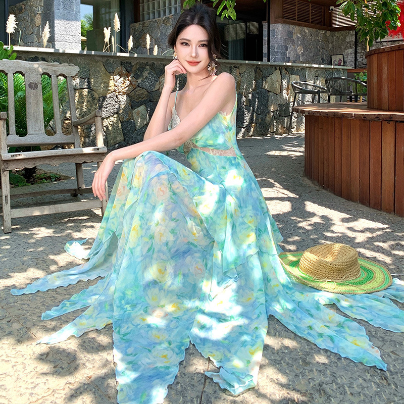 不規則なレイヤードレースステッチとスミッジプリントのリゾート風サスペンダーロングドレス