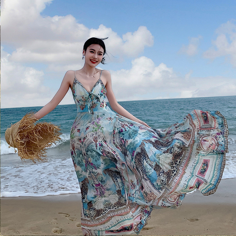ボヘミアンスタイルのレトロなサスペンダードレス、女性のセクシーなバックレスビーチバケーションロングドレス