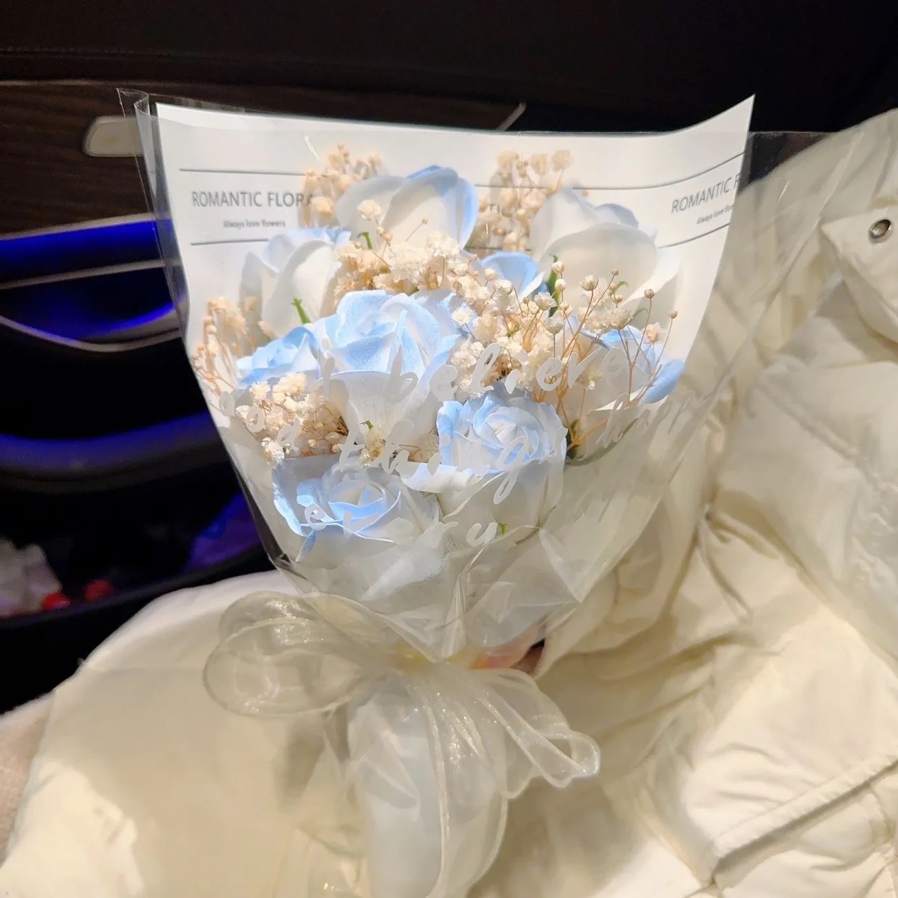 クリスマスやバレンタインデーのギフトに、彼女に贈る完成品の砕氷ブルーローズブーケ、造花石鹸の花、永遠のドライフラワーブーケ