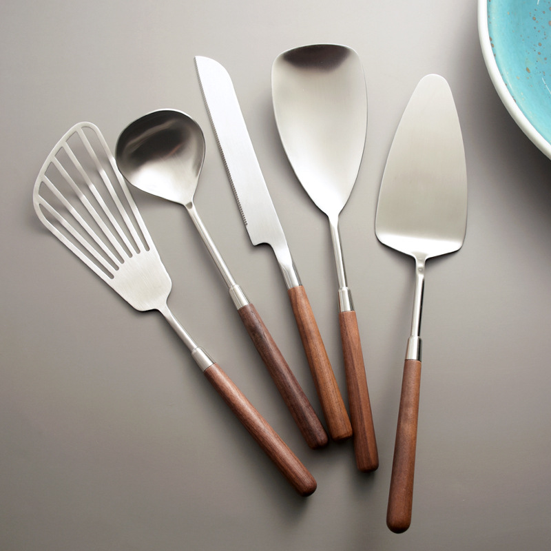 キッチン家庭用304ステンレス胡桃木柄スプーン分食スプーンシャベル調理器具セットステーキナイフフォークスプーン食器