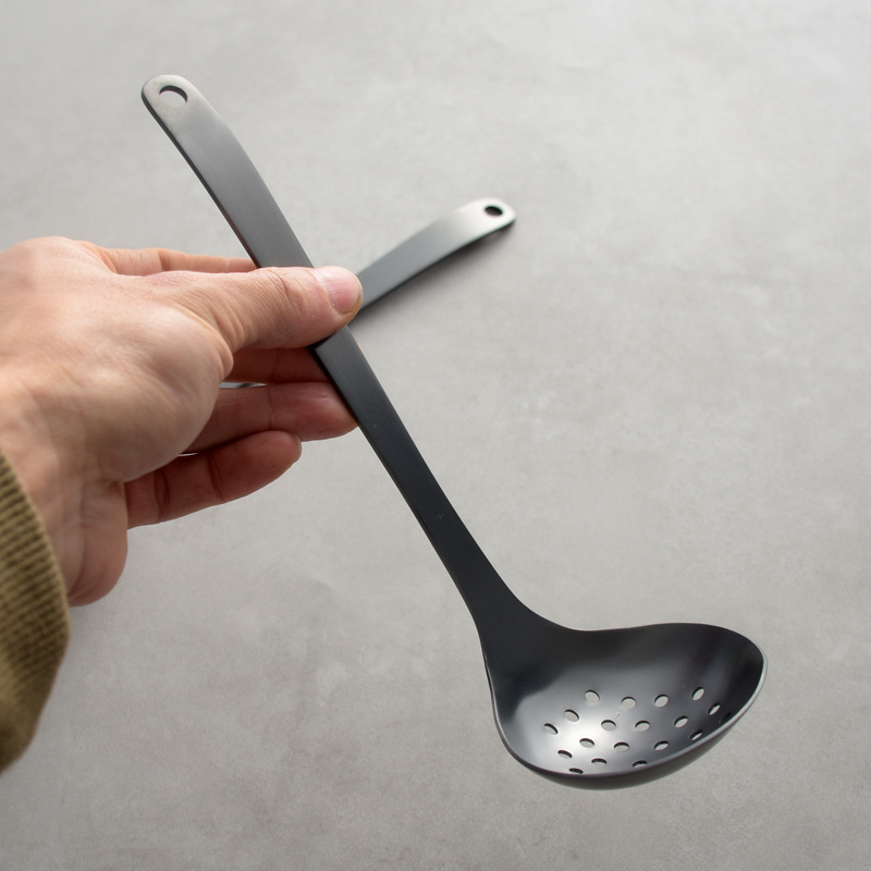 日本式304ステンレスの黒い柳の葉のスープはスプーンの鍋に漏れます。