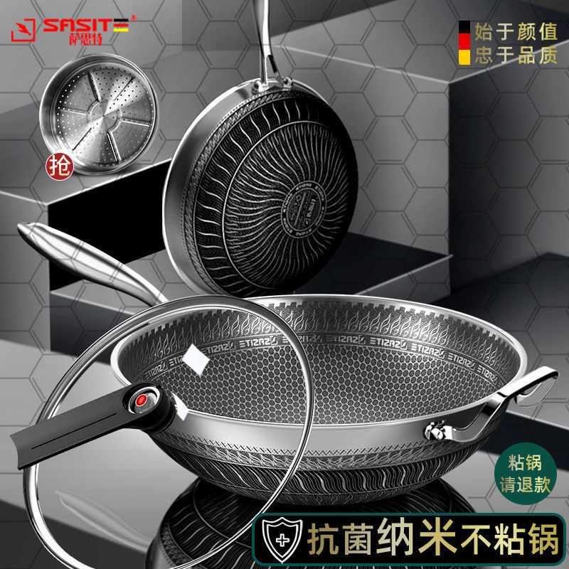 中華鍋 316ステンレス鋼製 抗菌ノンスティック鍋 ガスコンロ対応 ハニカム模様 ノンスティック両面コーティング