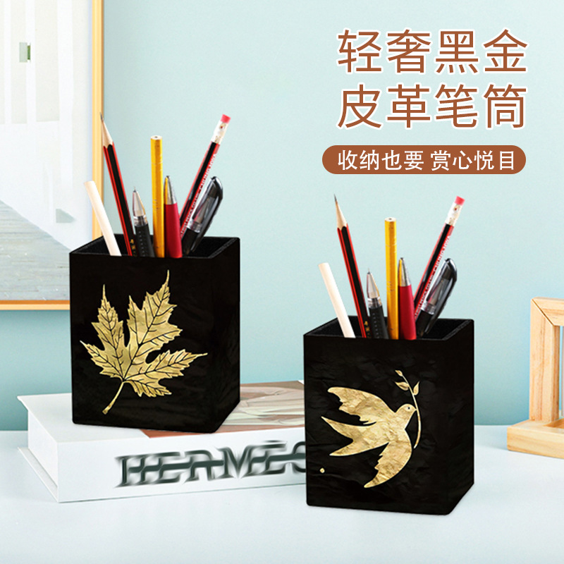 ブラックゴールドレザークリエイティブペンホルダーライト高級ハイエンド学生デスクトップ収納ボックスオフィスアートクリエイティブ装飾品