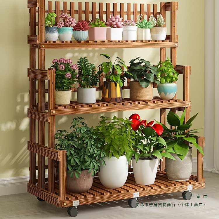 フラワースタンド収納ラックバルコニー 2024 新しいモバイル床置き型無垢材フラワースタンドホイール付きリビングルーム屋内防錆木材