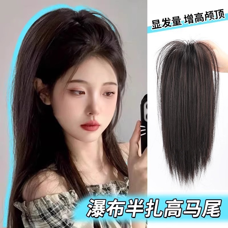 かつらの女性の長い髪のシミュレーションの滝の半分は高い馬尾の元気な少女を刺します。
