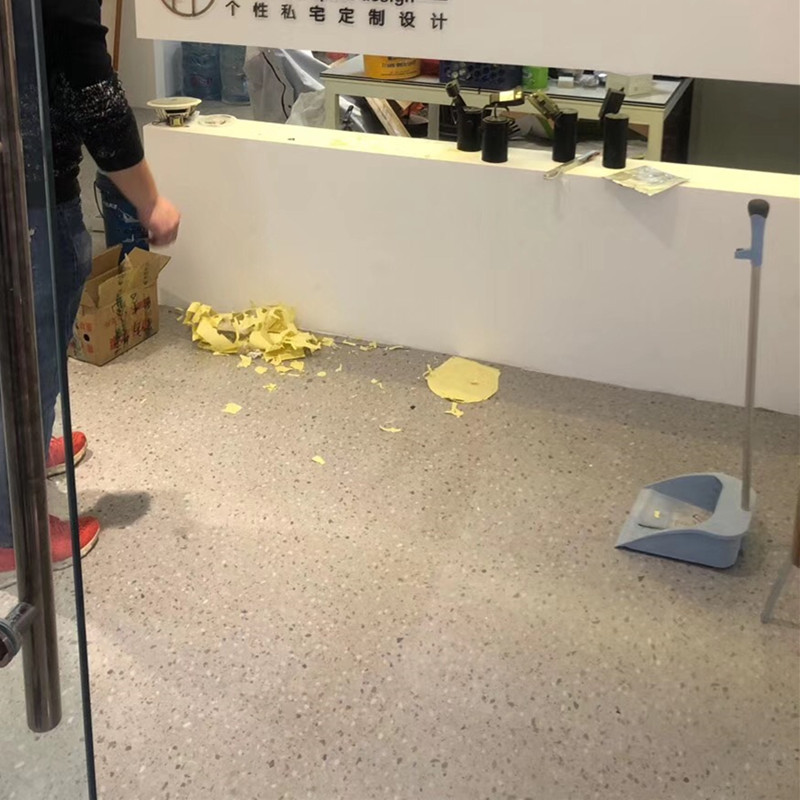 水砥石の床貼り現場の屋根裏PVC床革セメント地に直接発泡プラスチック床を厚く敷く