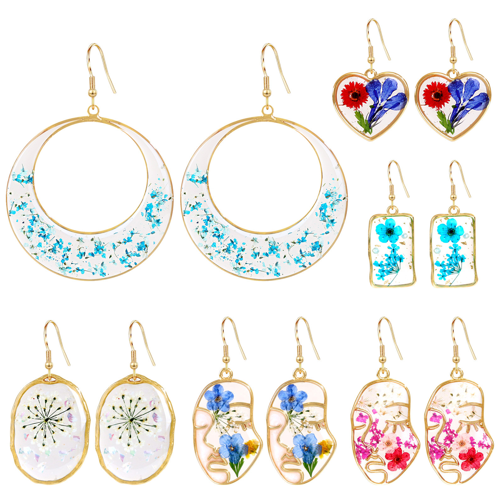 速卖通人気商品、個性的な不規則な形状のドライフラワーとエポキシ樹脂を使ったレディースイヤリング、誇張された幾何学模様のイヤリング、クロスボーダーメタルイヤリング