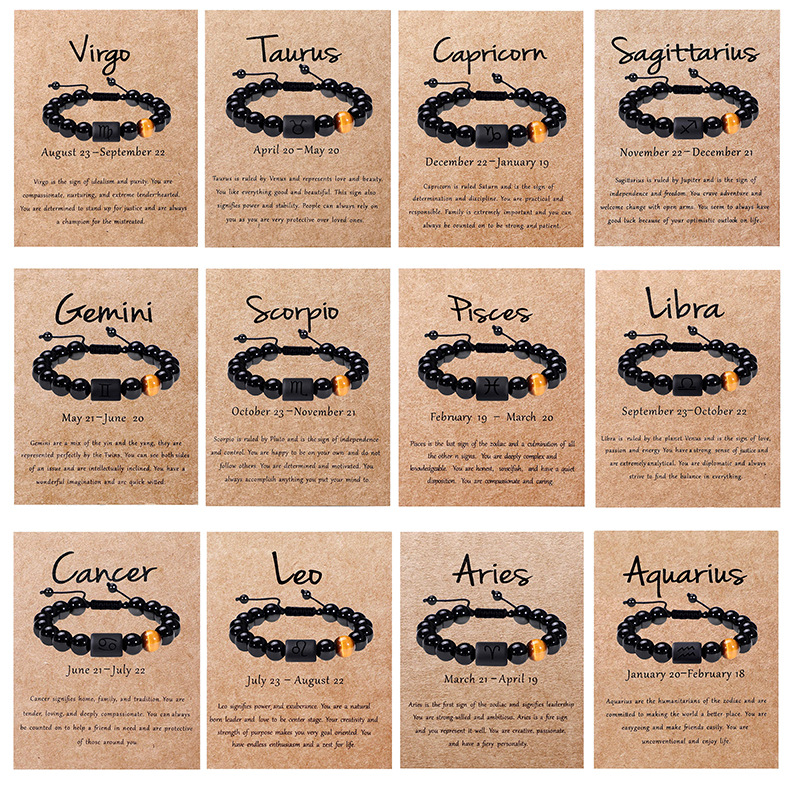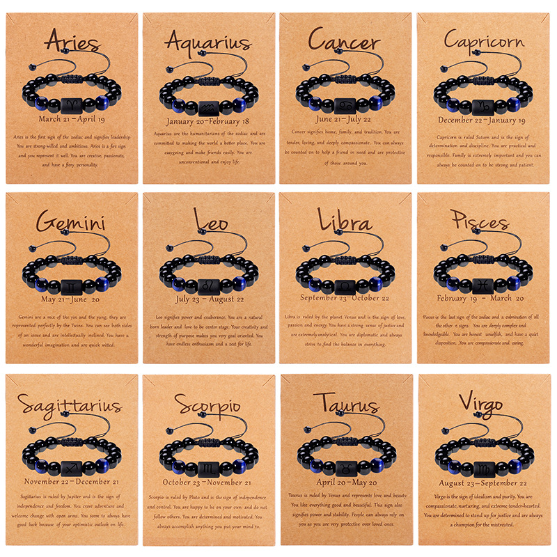 国境を越えた人気の12星座ビーズブレスレット、男性と女性用の編み込みブレスレット、天然ブルータイガーアイビーズブレスレット、外国人ハンドアクセサリー