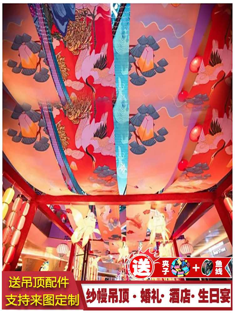 国潮風のガーゼのカーテンの装飾の防水の布地の結婚祝いの背景は赤い古風の結婚式の屋根の赤い布のカーテンを吊り上げます。