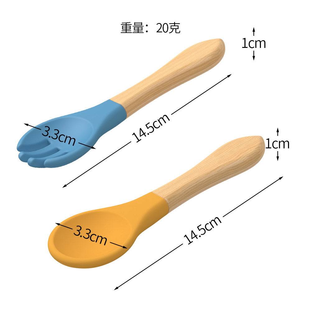 現物は木の柄のフォークのスプーンを提供します。子供は食事を勉強します。