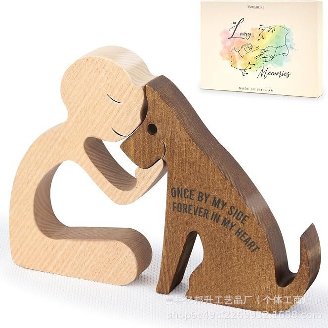 クロスボーダー木製置物家族と犬セット木製彫刻リビングルームデスクトップペット記念木製置物卸売