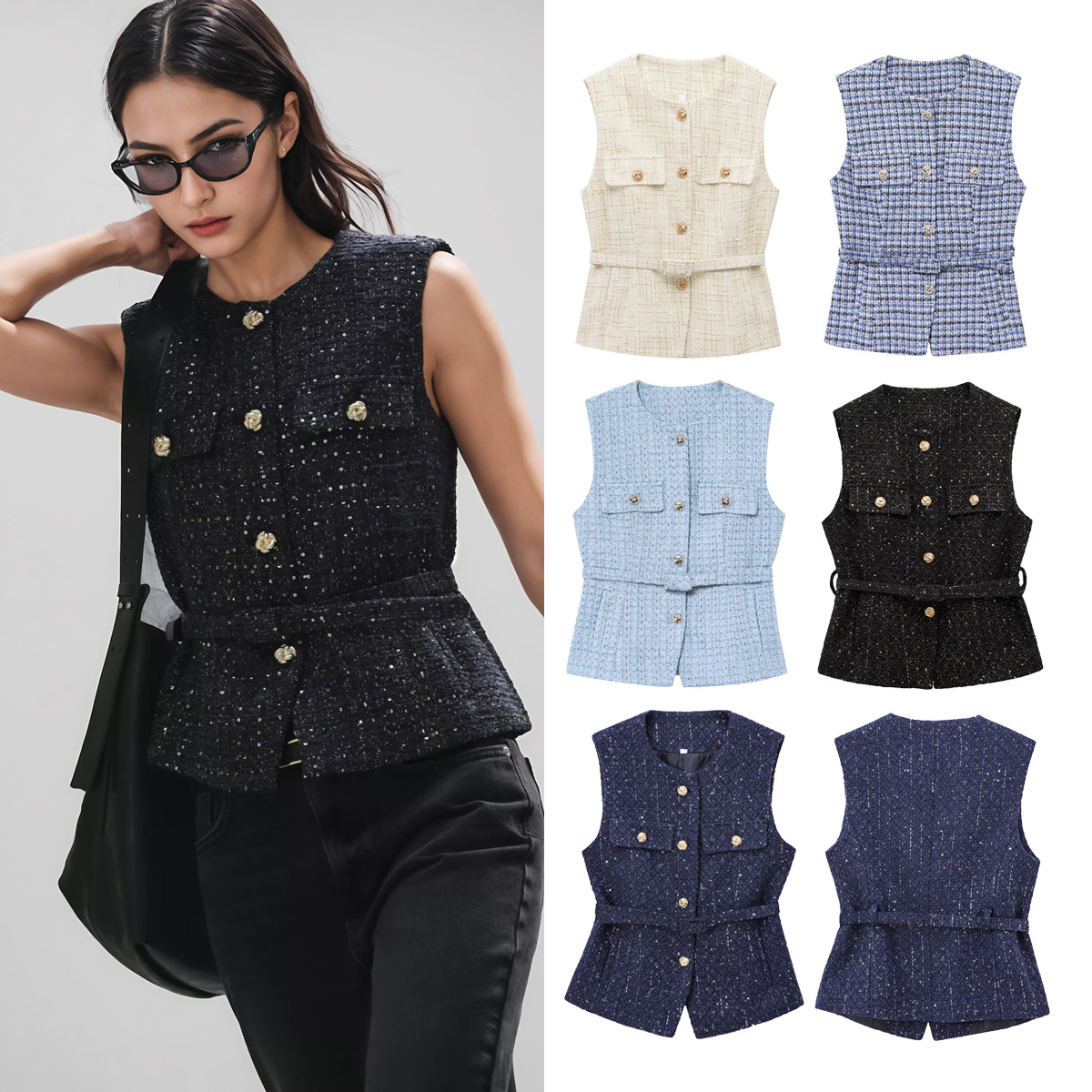 2025年秋ファッション新作 ベルト付き ビーズ装飾 テクスチャベスト クロスボーダー Amazon レディースウェア M56940