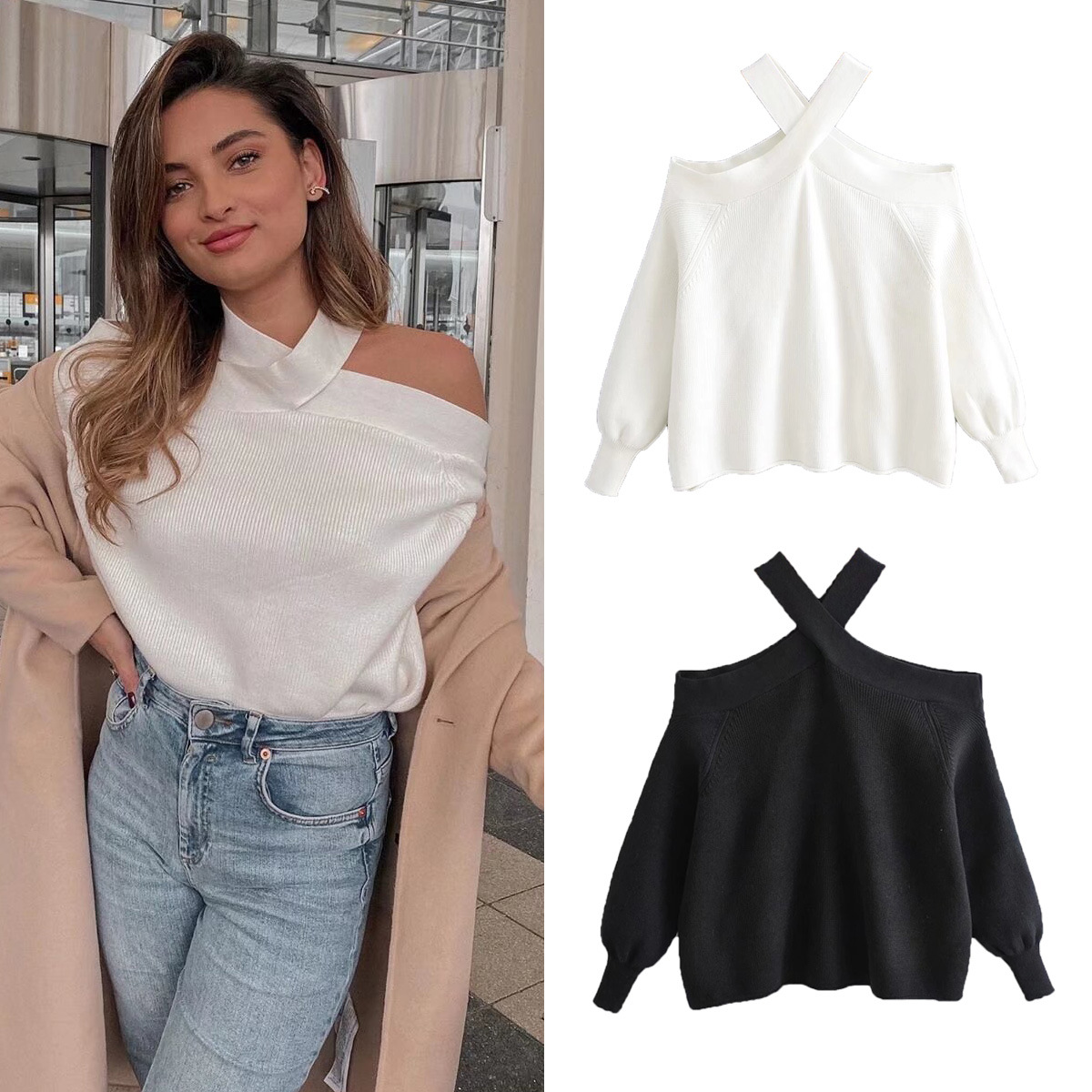 外国貿易の婦人服の2024秋冬の新型の欧米のinsは肩のセクシーなゆったりしているニットのプルオーバーのセーターの女性b 6を現します。