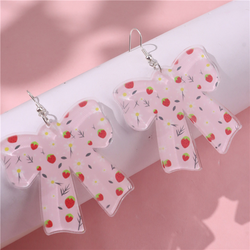 欧米の越境創意ピンクのイチゴの蝶結びのプリントのストライプの蝶結びのアクリルのペンダントのイヤリング