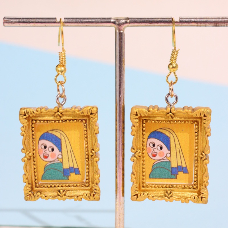 ミニチュア樹脂アートゴールデンフォトフレームイヤリングレトロ油絵ゴールドとシルバーフォトフレーム光沢のある楽しいデザインイヤリング