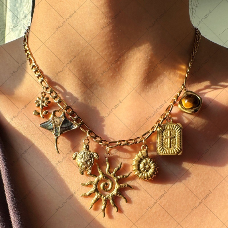 国境を越えた欧米ステンレス金色の太陽花貝殻海星ペンダント鎖鎖高級感デザイン誇張アクセサリー