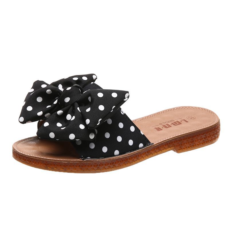 牛の筋の柔らかい底の蝶結びの外は平底のスリッパの女性を着ます。