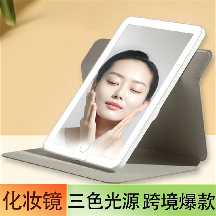 国境を越えた起爆金は回転可能な皮カバー充電金三色照明LED化粧鏡ランプ付き折り畳み旅行補光鏡