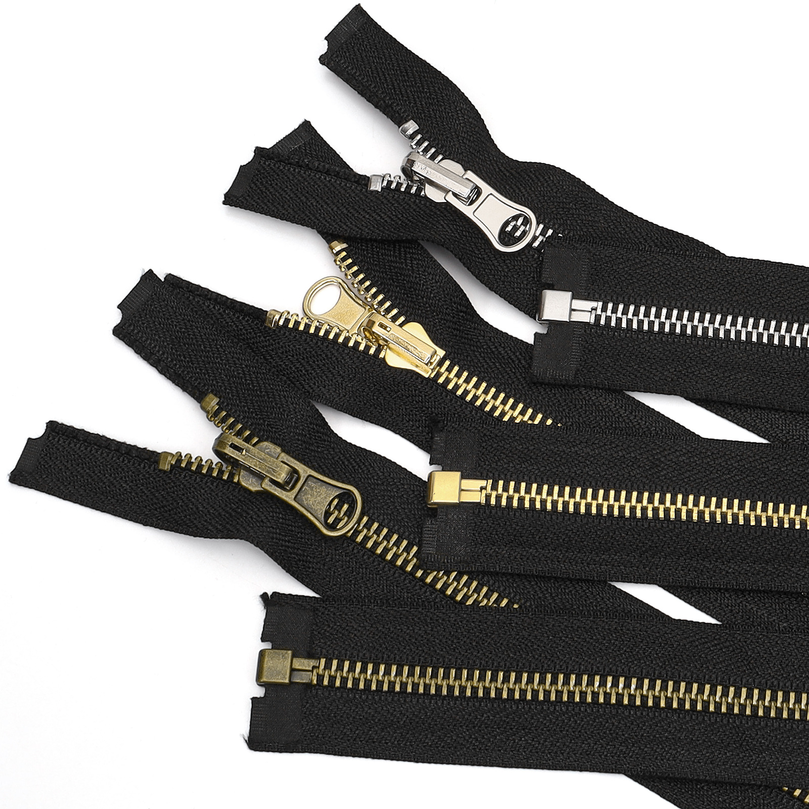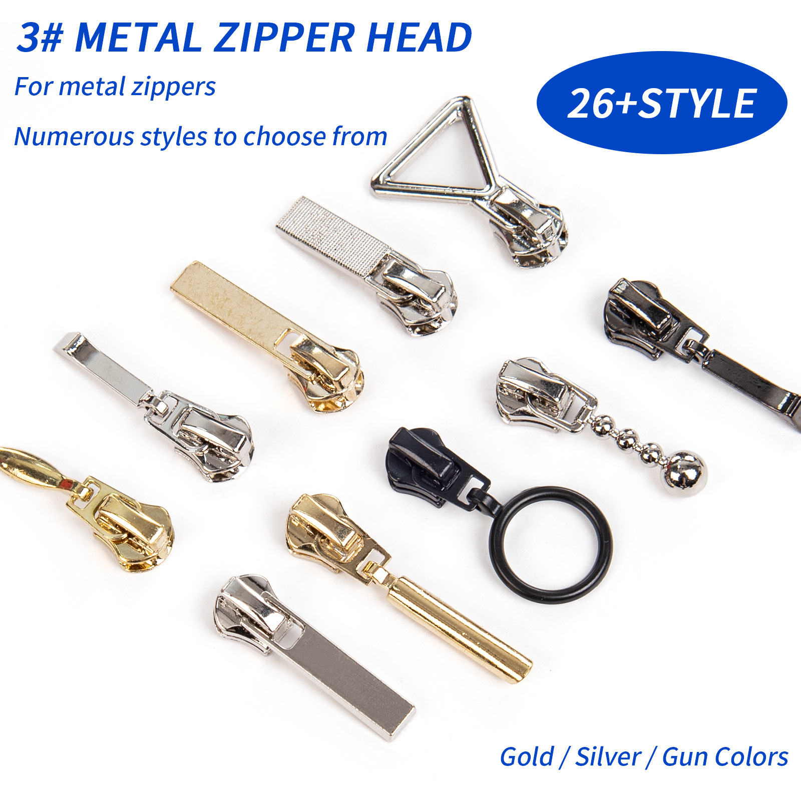 No.3 メタルプルヘッド、ホワイトライトゴールドガンカラー、電気泳動ブラックジッパーヘッド、さまざまな形状、バッグや衣類に適しています