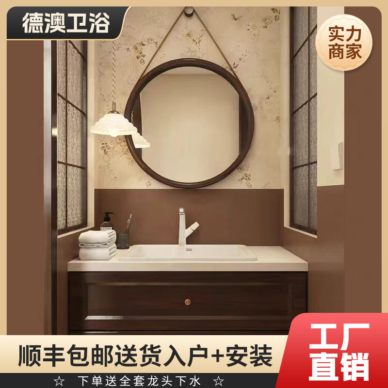 新中国式古風陶磁器一体盆浴室キャビネット床掃除ロボット折り畳み風水鏡洗面台胡桃木色
