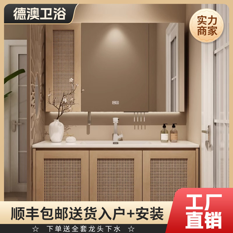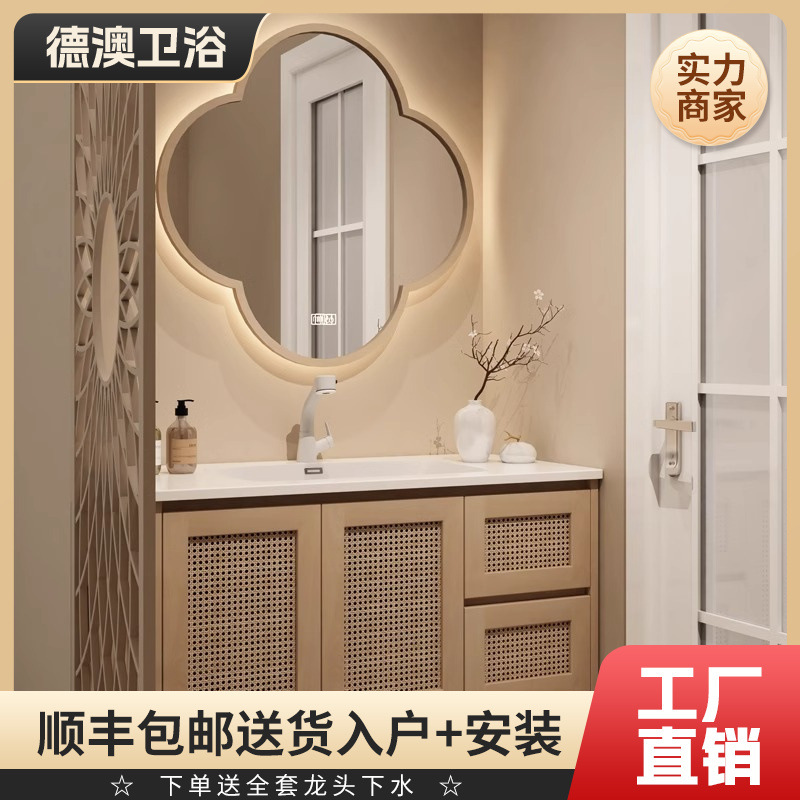 レトロ籐編みバスルームキャビネットセットセラミック一体盆日本式原木風洗面台洗面台スマートミラーキャビネット