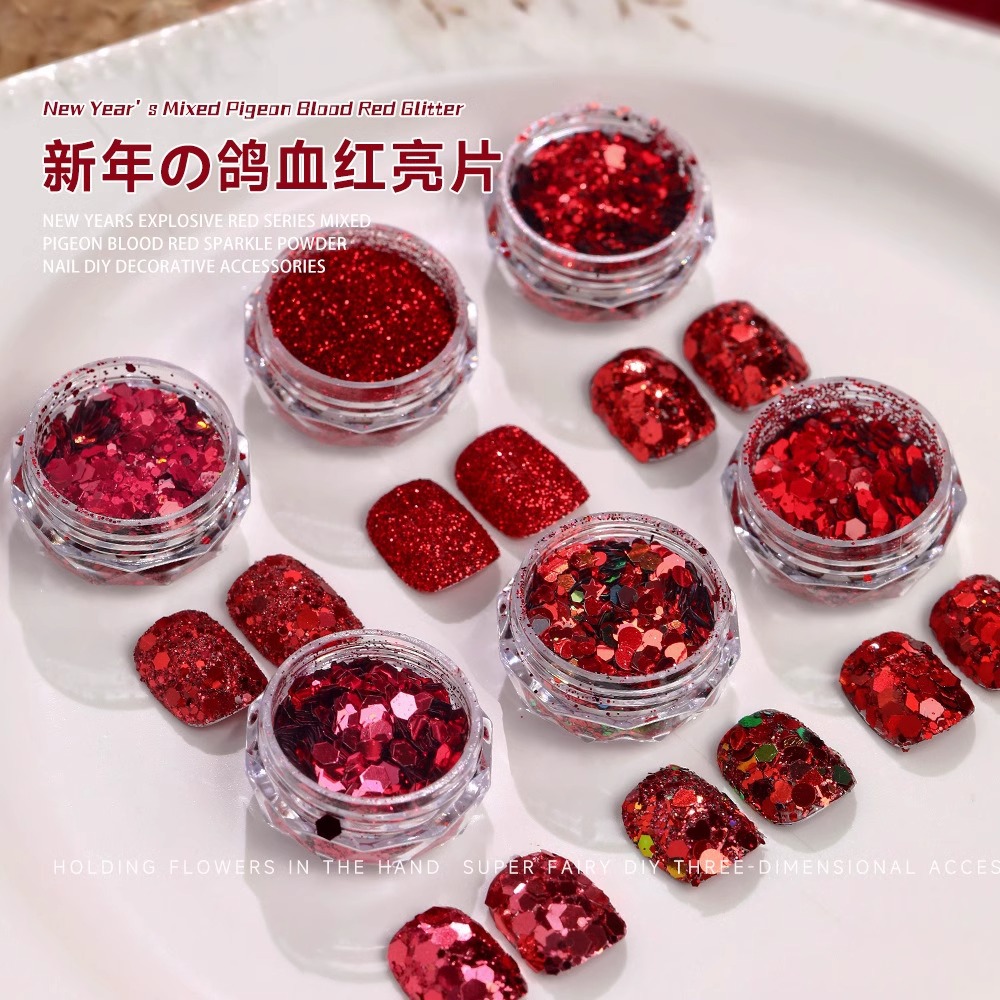ネイルアート用赤いグリッターパウダー装飾品2025年ネット人気商品新年ピジョンブラッドレッドネイルデコレーション卸売
