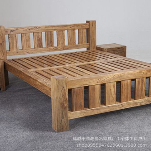 木製ツインベッド原木主臥家具中国式シンプル民宿ツインベッド家庭用寝室老楡木大ベッド