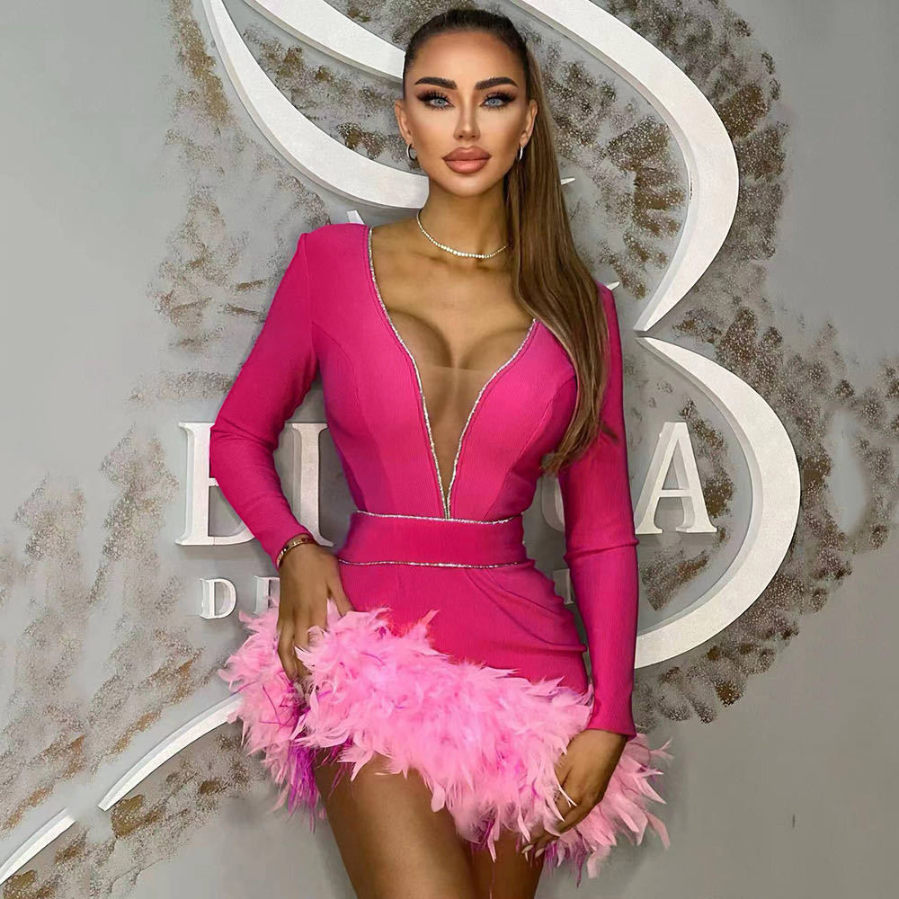 羽毛ミニスカートのドレスの包帯のワンピースのフランス式の深いvはダイヤモンドの長袖のショートスカートの工場をつなぎ合わせて卸売りします。
