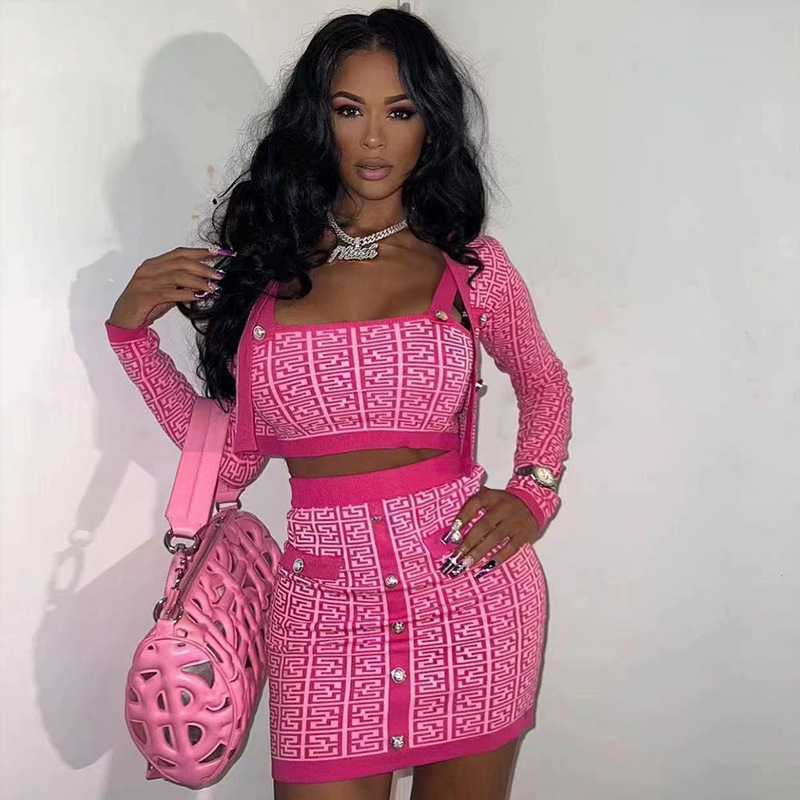 欧米のスカートのスーツのハイエンドの包帯のドレスの工場の長袖のカーディガンのベストはヒップのスカートのジャカードの3つのセットの越境を包みます。