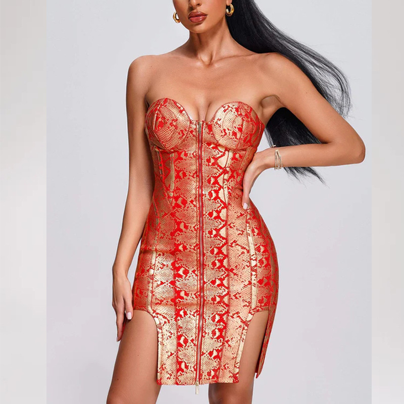 欧米の蛇の紋様のワンピースは胸の前のファスナーを拭いてヒップのスカートのクラブのセクシーなミニスカートの包帯を包んで金のドレスのスカートにアイロンをかけます。