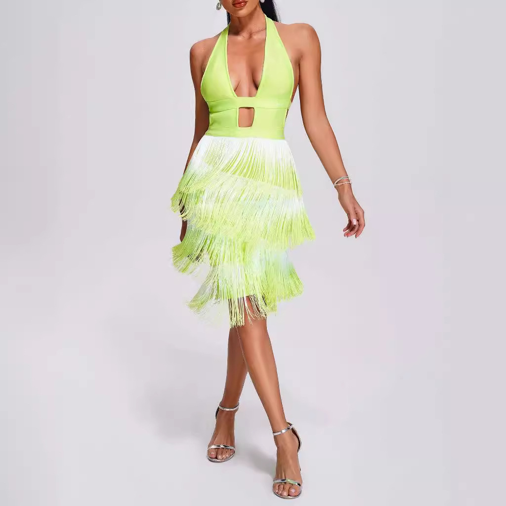 包帯蛍光緑ワンピースフリンジバッグヒップスカート首掛け無肩ベルト露背ワンピースギャル欧米クロスボーダー