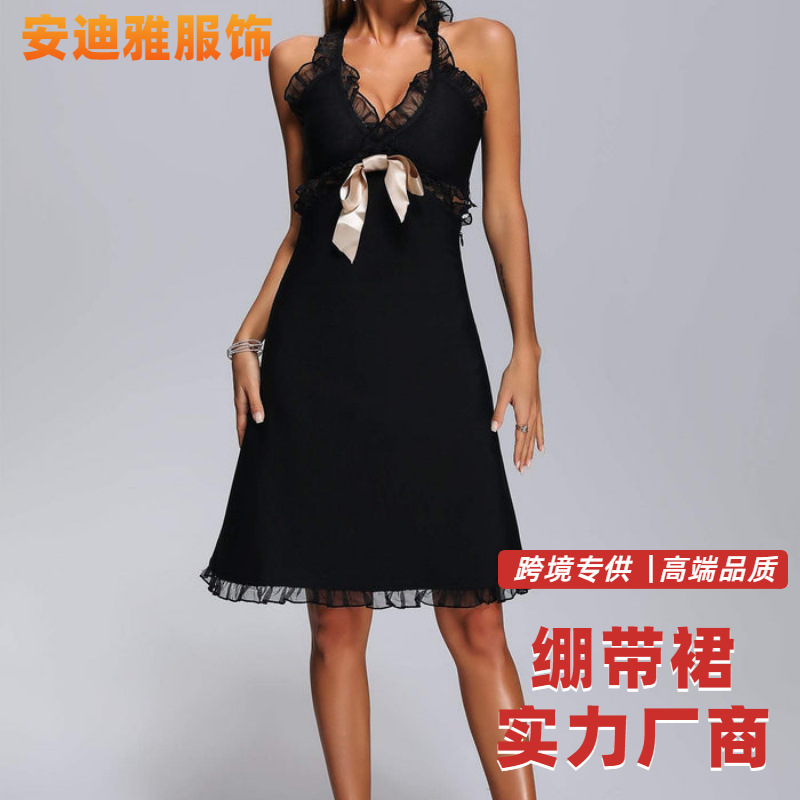 外国貿易の欧米の黒色の深いvレースの辺のa字のスカートの蝶結びの装飾の交差するガーターの首の包帯のワンピース