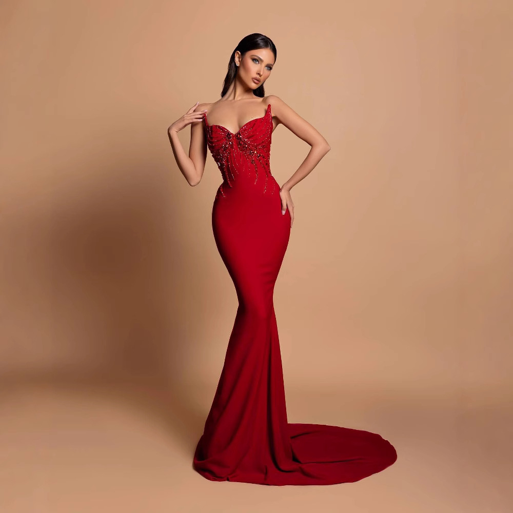 ビーズのサスペンダーのワンピースの赤い現物の対外貿易の新型の2025ハイエンドの長いタイプのタキシードのセクシーな明るいスカート