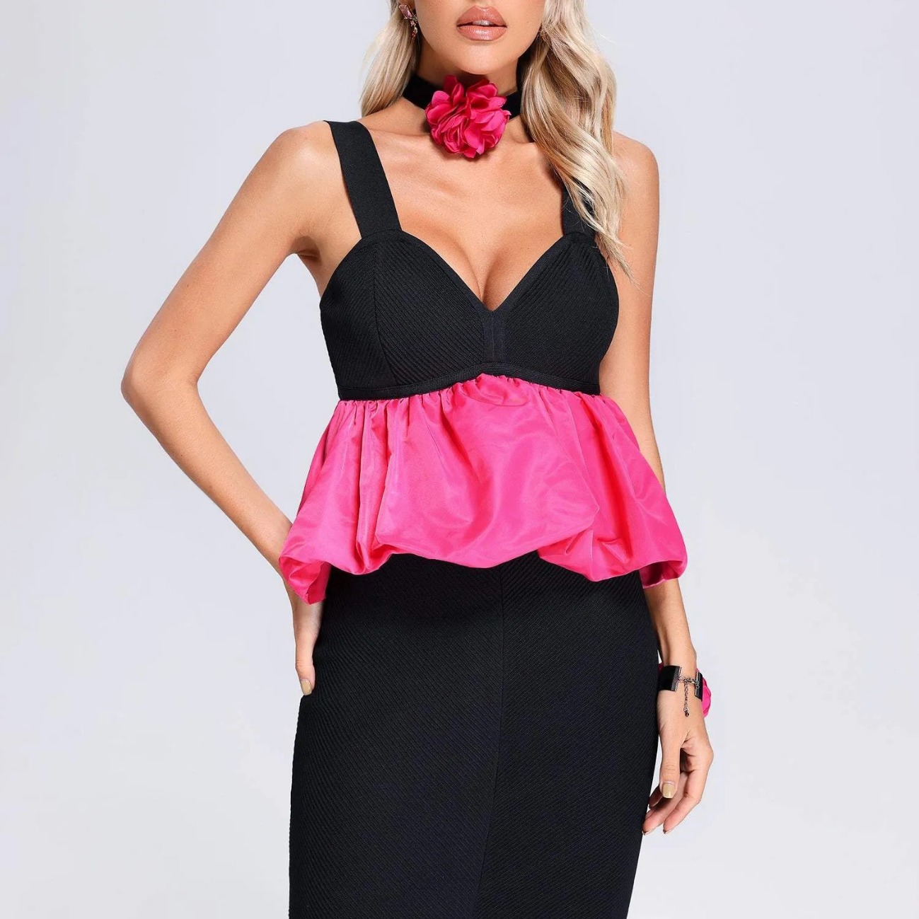 国境を越えた女装の新型衝突色ストラップワンピース優雅ファッション高腰痩せ花包帯ロングスカート卸売り